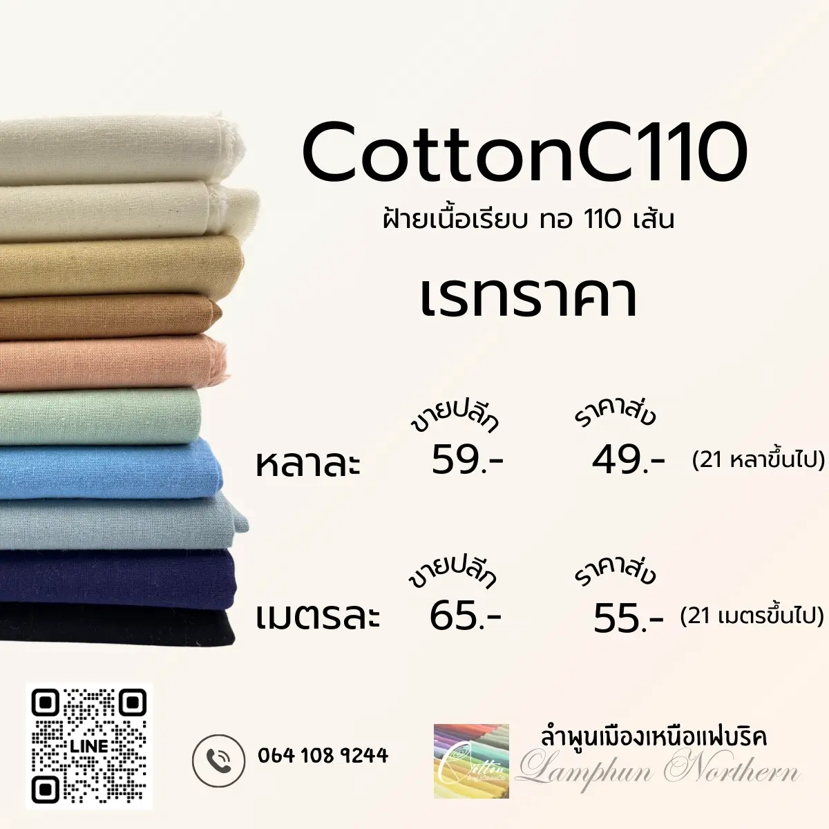 ขายปลีก 59/หลา ราคาส่ง 49/21 หลาขึ้นไป ขายปลีก 65/เมตร ราคาส่ง 55/21 เมตรขึ้นไป